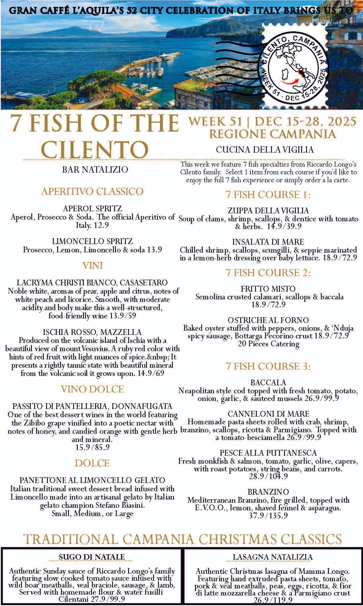 Each week of the year we visit a different city in Italy and feature their local bar, wine, & cuisine. This week we celebrate the feast of the 7 fishes in Cilento, Campania